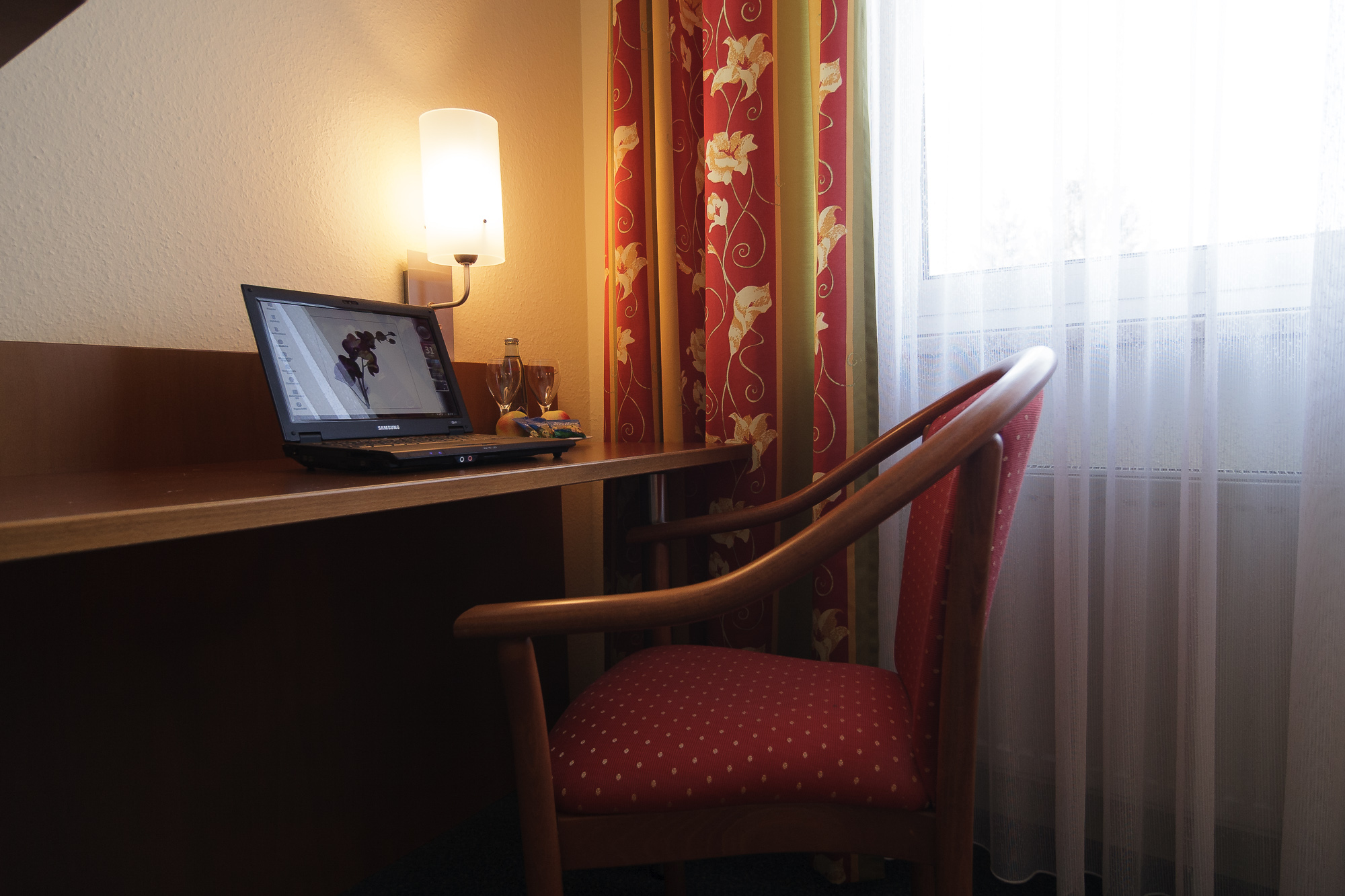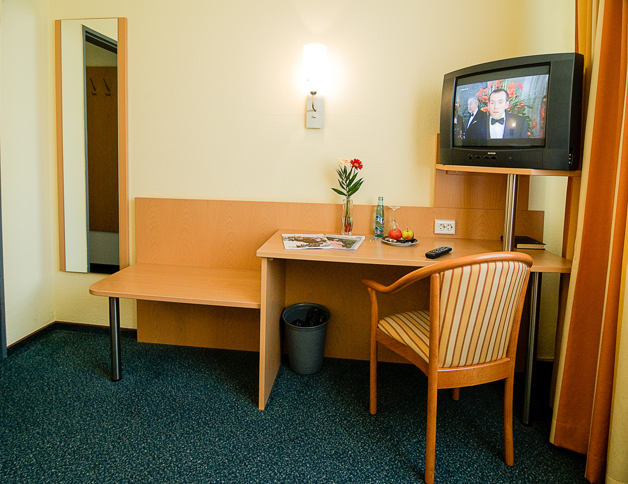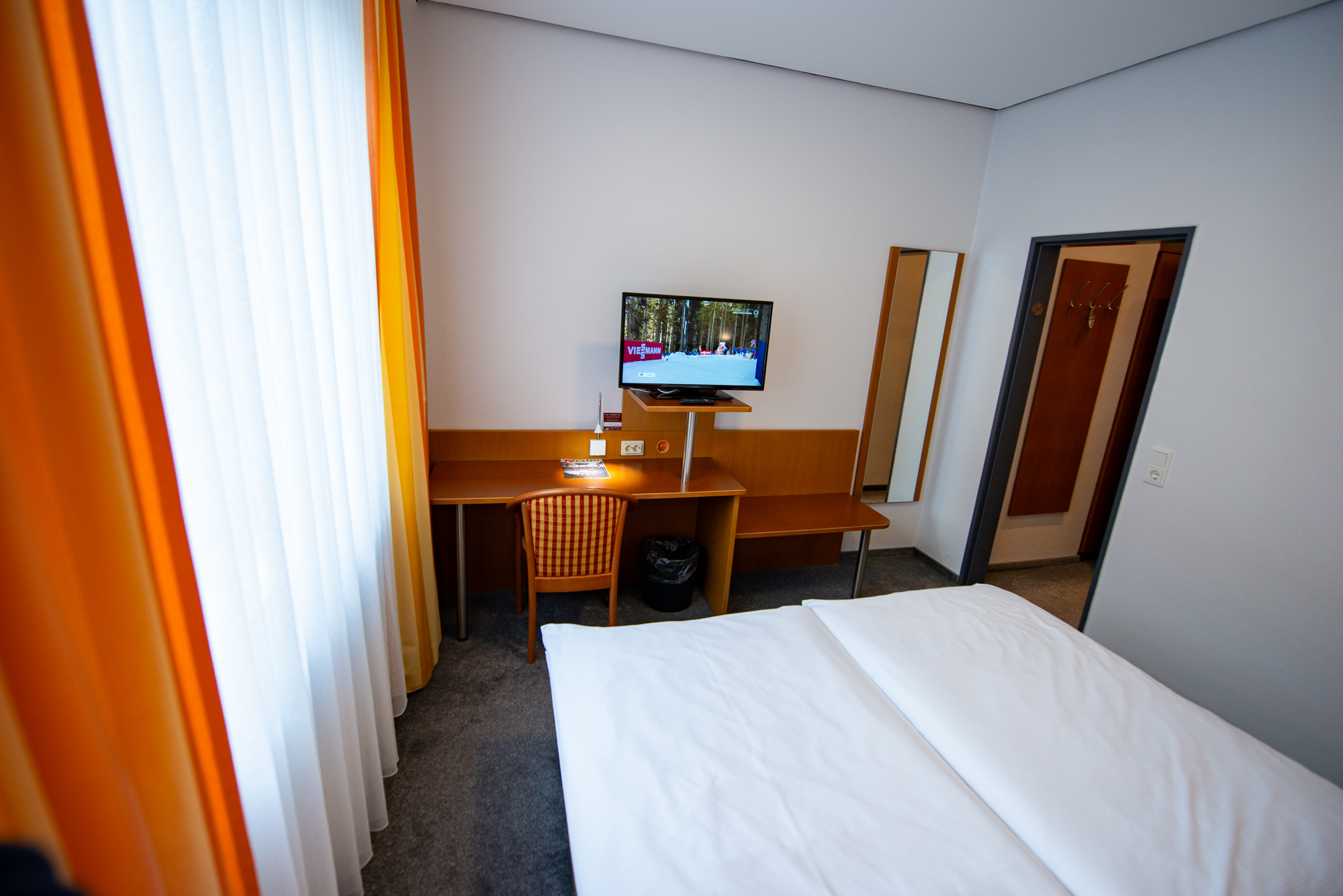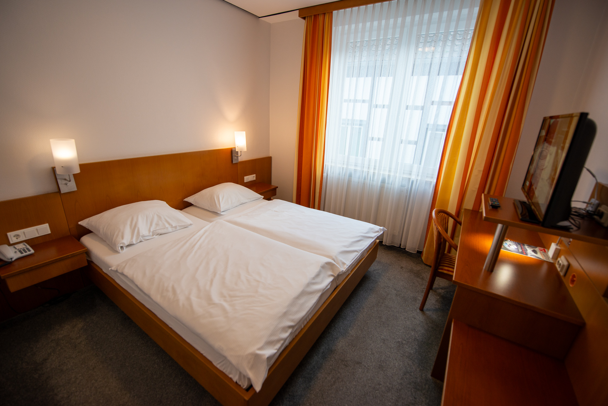 Die Bettmatratzen sind 90×200 cm groß. Für eine ruhige Nacht auf dem Zimmer sorgen die ruhige Lage ohne eine größere Straße in der Nähe und „Blind out“-Verdunklungsgardinen.