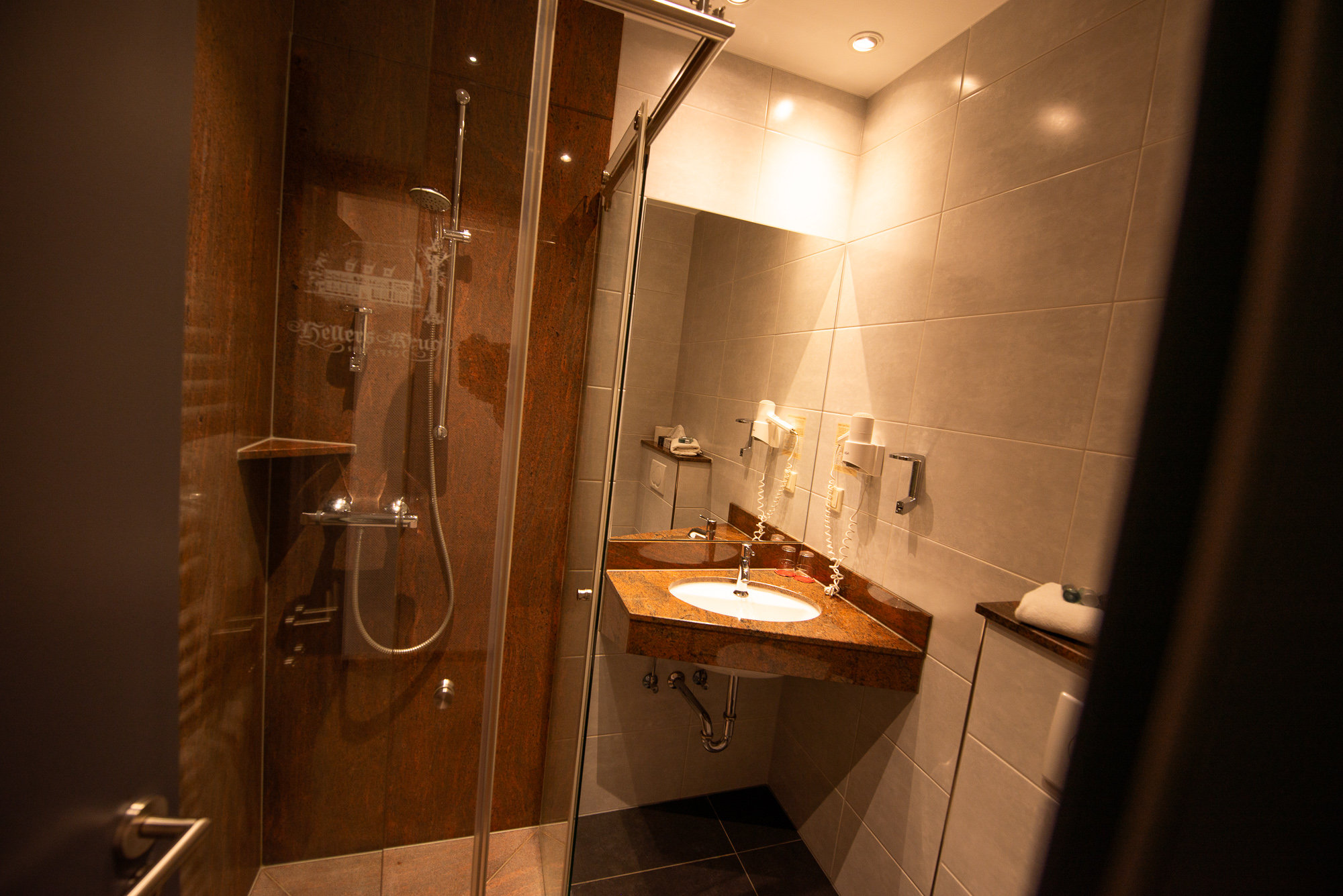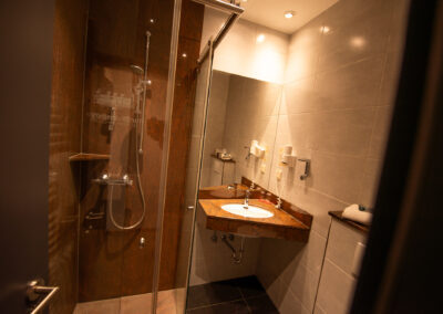 Auch in den Badezimmern der Economyzimmer finden Sie die modernen ebenerdigen Granitduschen.