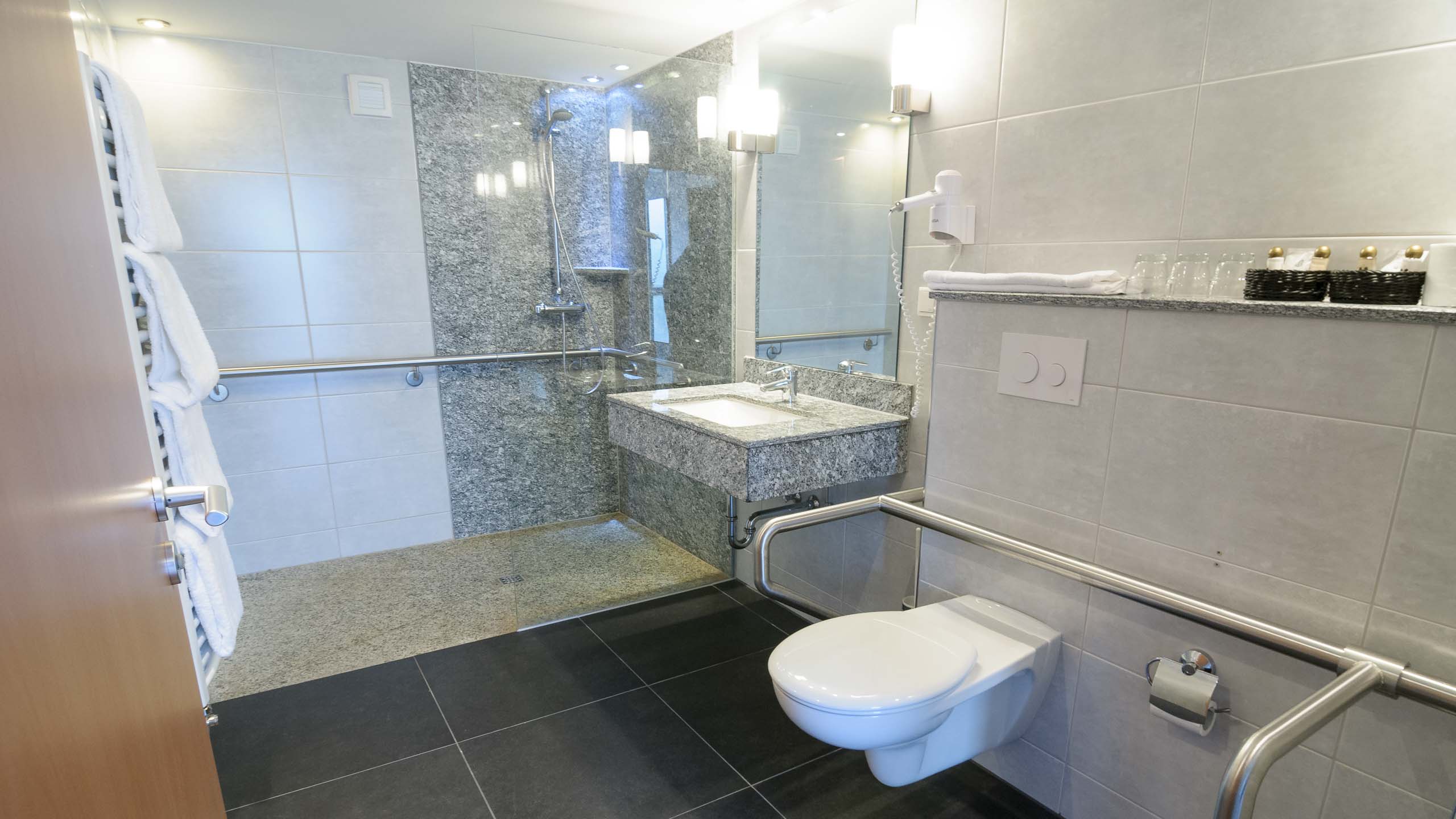 Eines der beiden Familienzimmer ist auch als rollstuhlgerechte Unterkünfte verwendbar. Sie können direkt vor der Zimmertüre parken und kommen ebenerdig in das Zimmer.